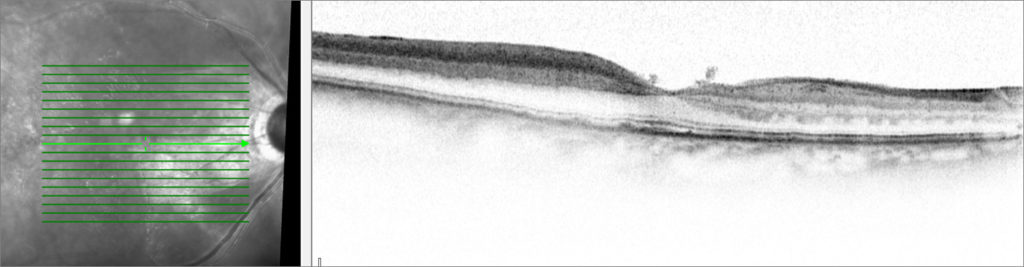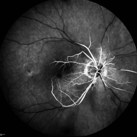 A 80-year-old female experimented nasal visual field loss in her right eye (OD) with preserved temporal visual field. Her past medical history was significant for age-related macular degeneration and hypertension. Best-corrected visual acuity was 6/6 OD and 6/9 OS. A pupillary afferent defect was present OD. Slip lamp examination was unremarkable in both eyes. Fundus examination OD revealed a whitened posterior pole with sparing in the papillomacular bundle. Spectral-domain optical coherence tomography OD revealed inner retinal hyperreflectivity with fovea sparing (Fig 1A). Fluorescein angiography showed a central retinal artery occlusion (CRAO) with cilioretinal sparing OD (Fig 1B).
