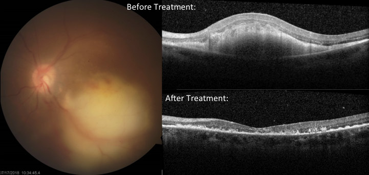 An otherwise healthy 43 year old female, originally from the Phillipines, living in Calgary for 38 years, presented to Emergency Department with a fever and flu- like symptoms. Blood cultures were positive for Klebsiella Pneumoniae. The patient was found to have a liver abscess, pneumonia and was started on Intravenous (IV) Ceftriaxone 1 gram BID. One week after admission to the hospital she began to notice decreased vision in her left eye. On ophthalmic evaluation her BCVA was 20/20 in the right eye and HM in the left eye. SLE of the left eye revealed an anterior chamber reaction of 1+ cells and 2+ vitriitis. Fundus examination of the same eye revealed a large chorioretinal abscess with hemorrhages affecting the macula. Right eye exam was remarkable for a cotton wool spot. The Ceftriaxone IV dosage was doubled and an intravitreal injection of Ceftazidime 2.25 mg/0.1 cc was administered. Nine days post-injection she had significant improvement of the chorioretinal abscess, however there was notable macular atrophy with Count Fingers as visual acuity.