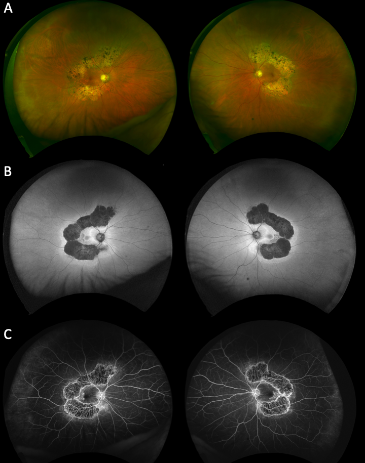 Optical coherence tomography showed thinning of the right optic nerve and slight thinning of left superior optic nerve, maculae were within normal limits. Goldmann and Humphrey 24-2 visual fields revealed partial ring scotomas, sparing the temporal visual fields bilaterally. Ultra-widefield pseudocolour imaging (Figure 1A), fundus autofluorescence (Figure 1B), and fluorescein angiography (Figure 1C) demonstrated findings in keeping with a diagnosis of posterior annular choroidal dystrophy.