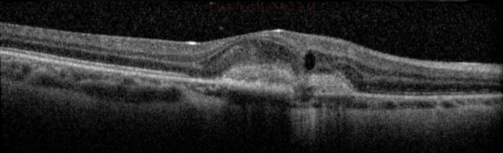 The patient received an intra-vitreal bevacizumab injection OD. Four weeks later, vision was unchanged with development of a serous pigment epithelial detachment (PED) in association with the prior observed fibrovascular CNVM. Further injections were not recommended as the visual gain was minimal due to chronicity of the CNVM given the fibrotic response. At recent examination, one-year post-presentation, there was minimal coalescence of the fibrovascular CNVM and PED, and vision has remained stable.