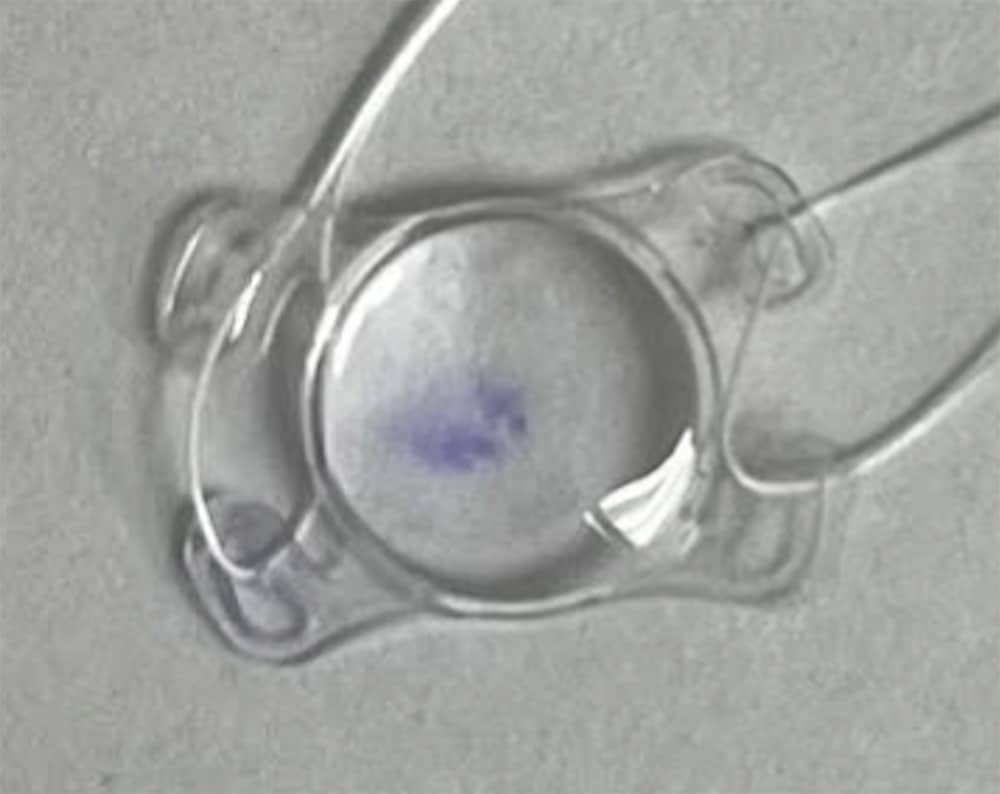 An 80-year-old male was booked for removal of a dislocated IOL and placement of a GorTex sutured Akreos AO60 lens. Before implantation a purple mark from the surgical marking pen was noted on the lens (Fig 1). With irrigation and manual scrubbing there was no clearing of the pigment. The lens was discarded and a new Akreos lens was inserted. Although opacification of the Akreos lens has been reported there are no known reports of staining of the lens with marking pen pigmentation. Care must be taken during surgery to avoid any inadvertent staining of the IOL before implantation.