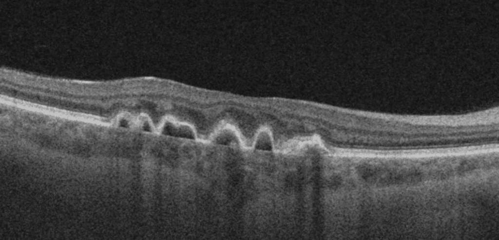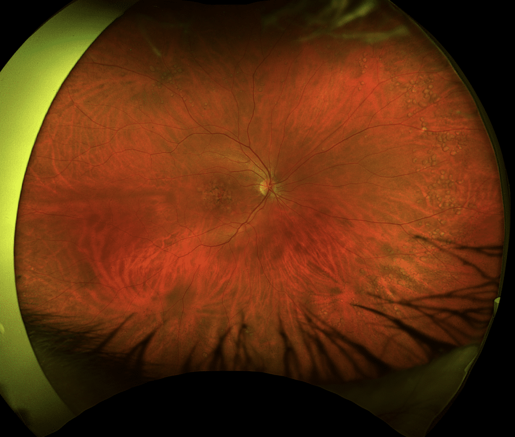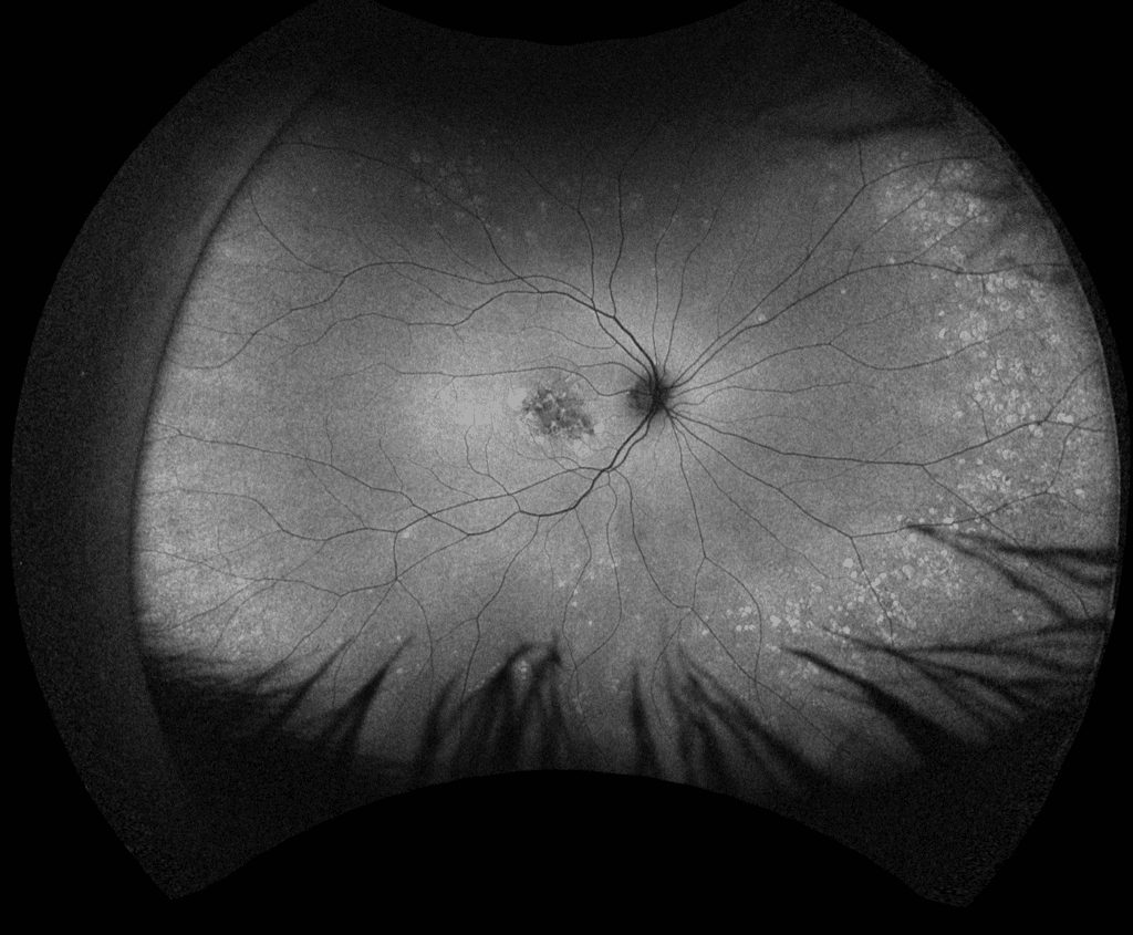 A 48-year-old female patient was referred by her optometrist for assessment of dry age-related macular degeneration. She had noted a gradual and painless decrease in her near and distance vision for several years alongside longstanding stable floaters. She denied photophobia, scotoma, and metamorphopsia, and had no history of other ocular diseases or previous ocular surgery. Her family ocular history was unremarkable. Past medical history was remarkable for renal disease secondary to glomerulonephritis which was diagnosed and treated with systemic steroids 10 years prior to her current presentation.